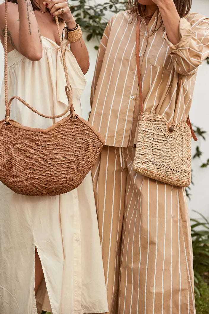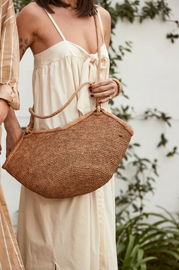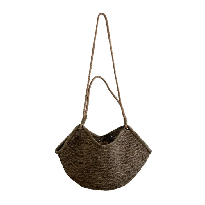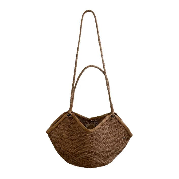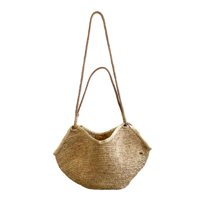 A delicate shell-shaped bag designed for everyday use, featuring beautifully braided double straps one long and one shorter for extra comfort – hand made and woven from durable, sustainably harvested raffia fibres