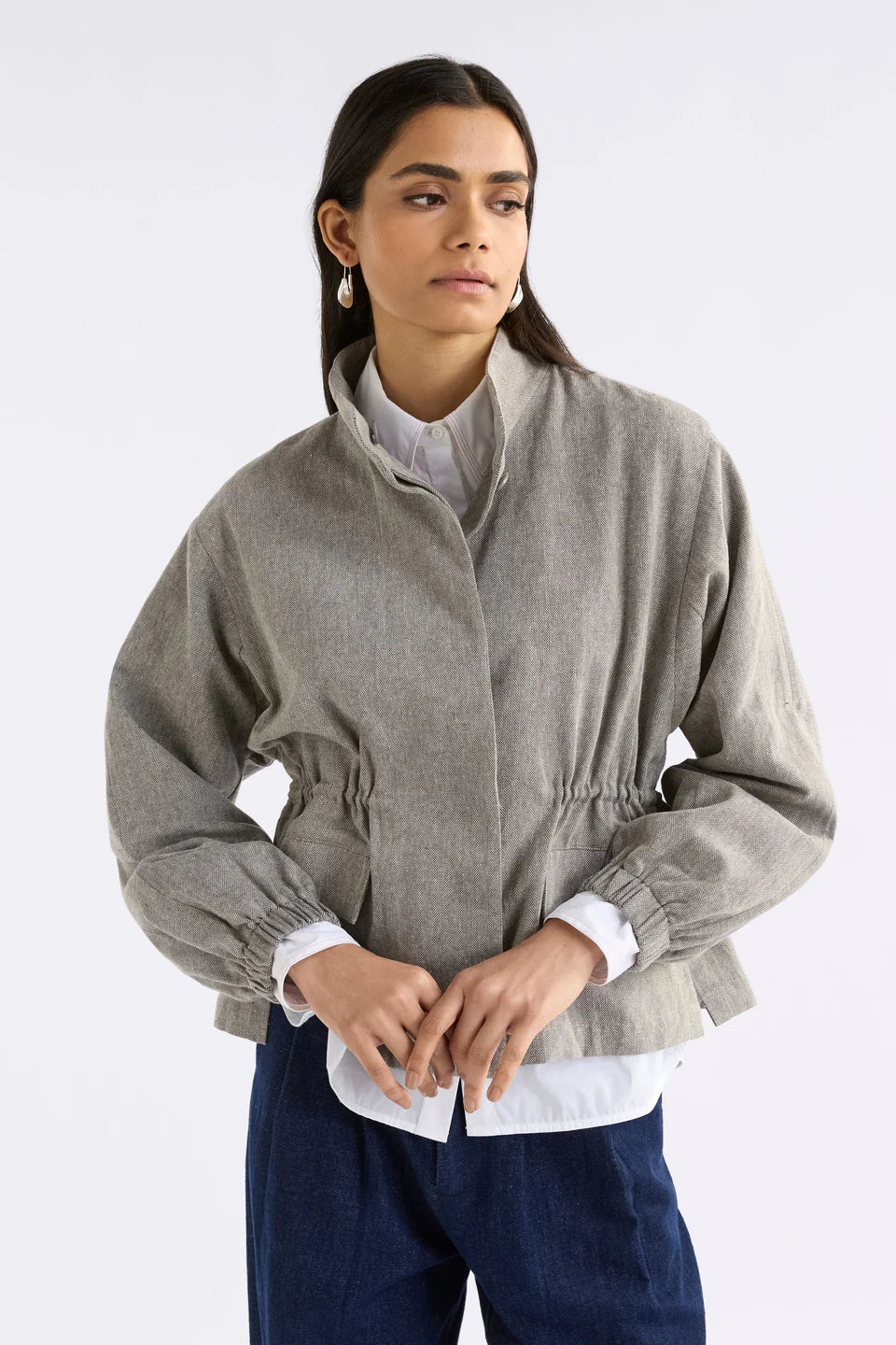 The Citte Jacket features a gathered waist silhouette and thoughtful design details. A relaxed fit with concealed button-through placket and adjustable internal drawstring creates a flattering gathered waist. A high collar stand and underarm gusset provide comfort and movement, while batwing back sleeves create clean lines. Crafted from a marle, textured, breathable linen and organic cotton blend.