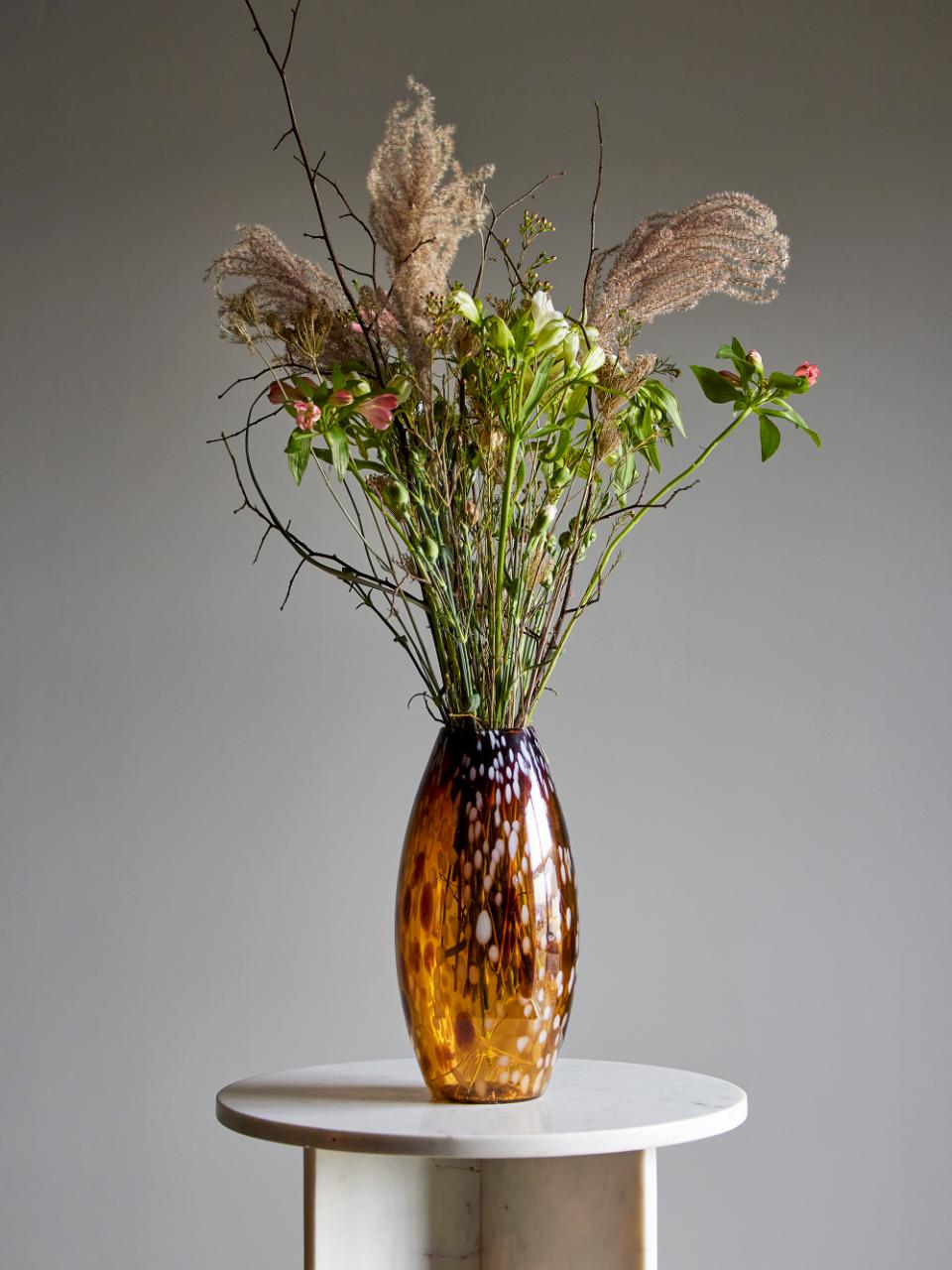 The Daraz Vase by Bloomingville is a unique mouthblown vase, with a special pattern in warm colors. The vase has a perfect shape for a big bouquet of fresh or dried flowers. Without flowers, the vase also stands as a very decorative piece that will add a femine touch to the home.