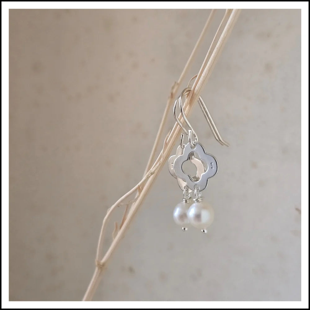 Shiny sterling silver clover silhouettes suspended with AAA grade freshwater pearls, finished on sterling silver earwires