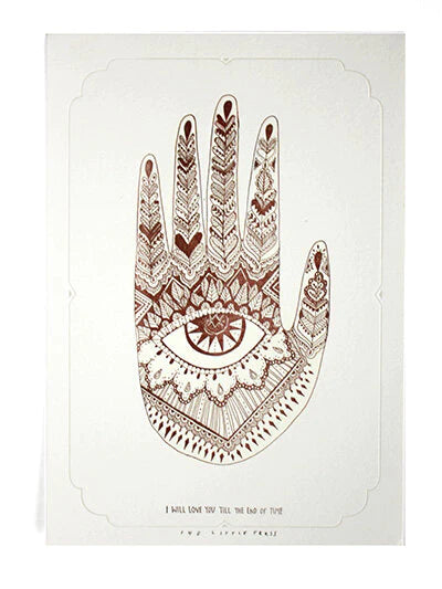 The words "I will love you till the end of time" underneath. A heavily decorated hand of fatima - a symbol of protection. Decorated in a marriage henna style design.