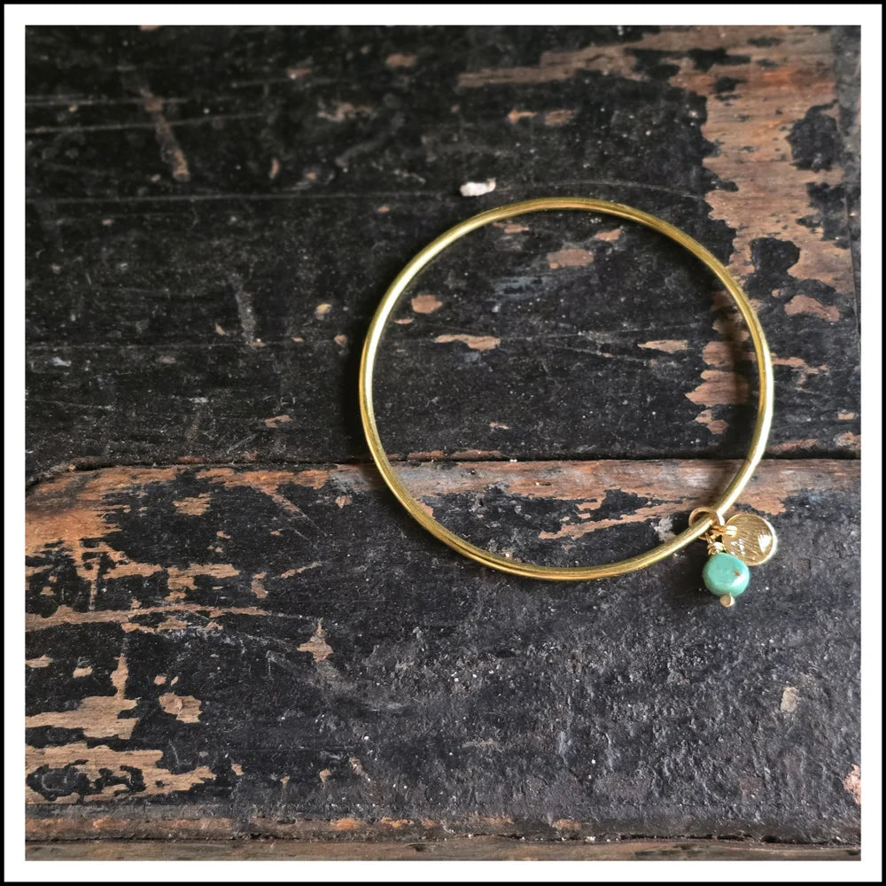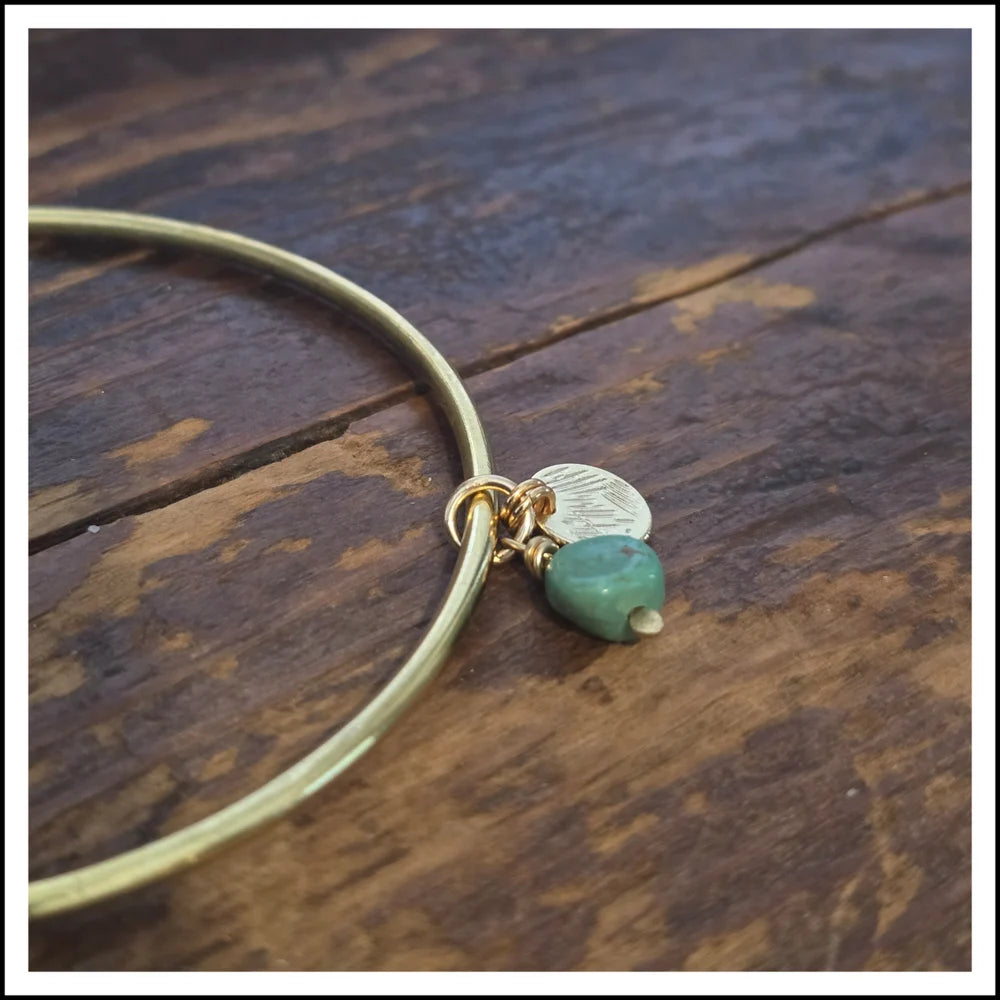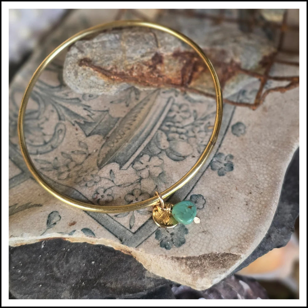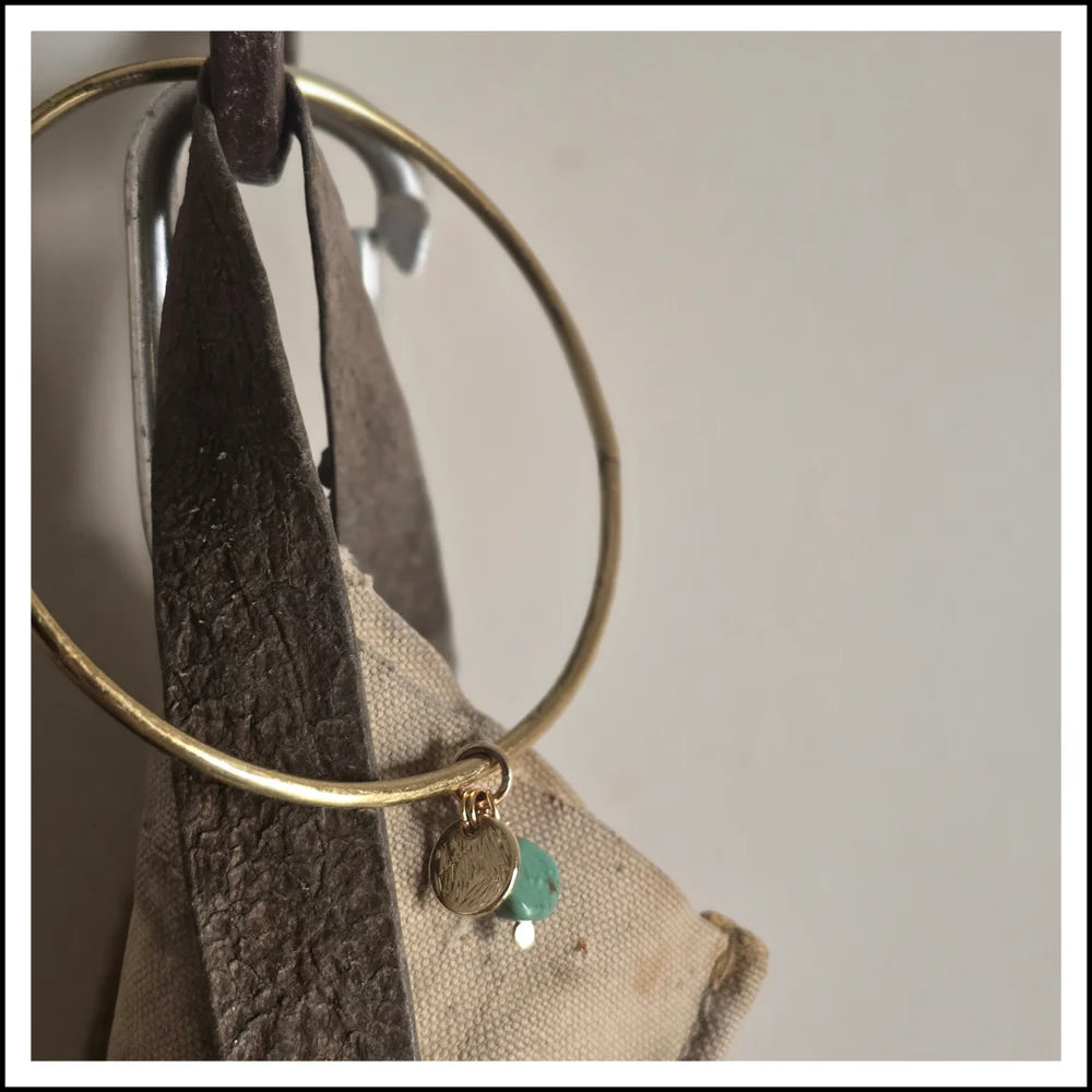 Shiny brass hand crafted bangle paired with a charm duet of natural turquoise stone + plated gold textured disk to emulate the setting sun