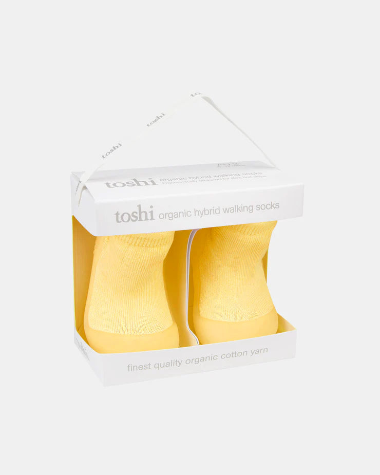 Toshi Organic Hybrid Walking Socks are ergonomically designed for life’s first steps. Our fusion shoe-socks feature an inner sock crafted from the finest quality organic cotton yarn. The organic cotton is soft and gentle on delicate feet, as well as our precious environment. Rubber soles cushion each step, providing flexibility, balance and stability. Baby safety is supported with a skid resistant rubber sole grip. Toshi Hybrid Walking Socks are designed for ease of slipping on and off. Carefully crafted with a knit cuff, our Hybrid Walking Socks stay on while maintaining healthy circulation. Adorn your baby’s feet with a sophisticated colour palette, refined design and intelligent functionality.