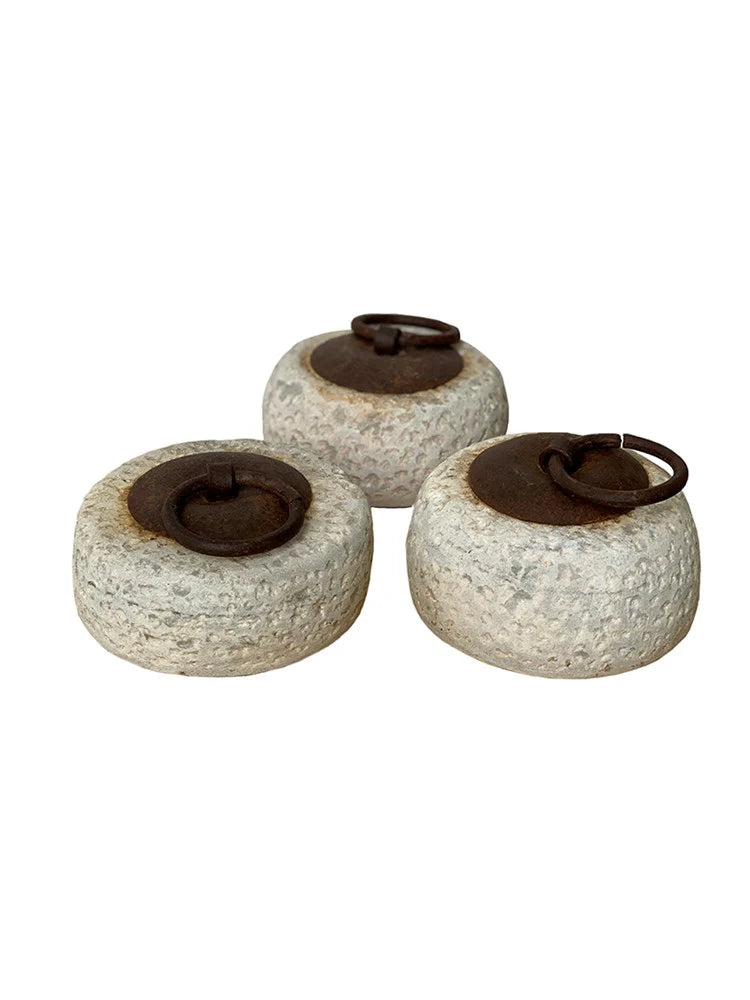 Each weight is crafted from a solid piece of stone and finished with a iron ring handle.