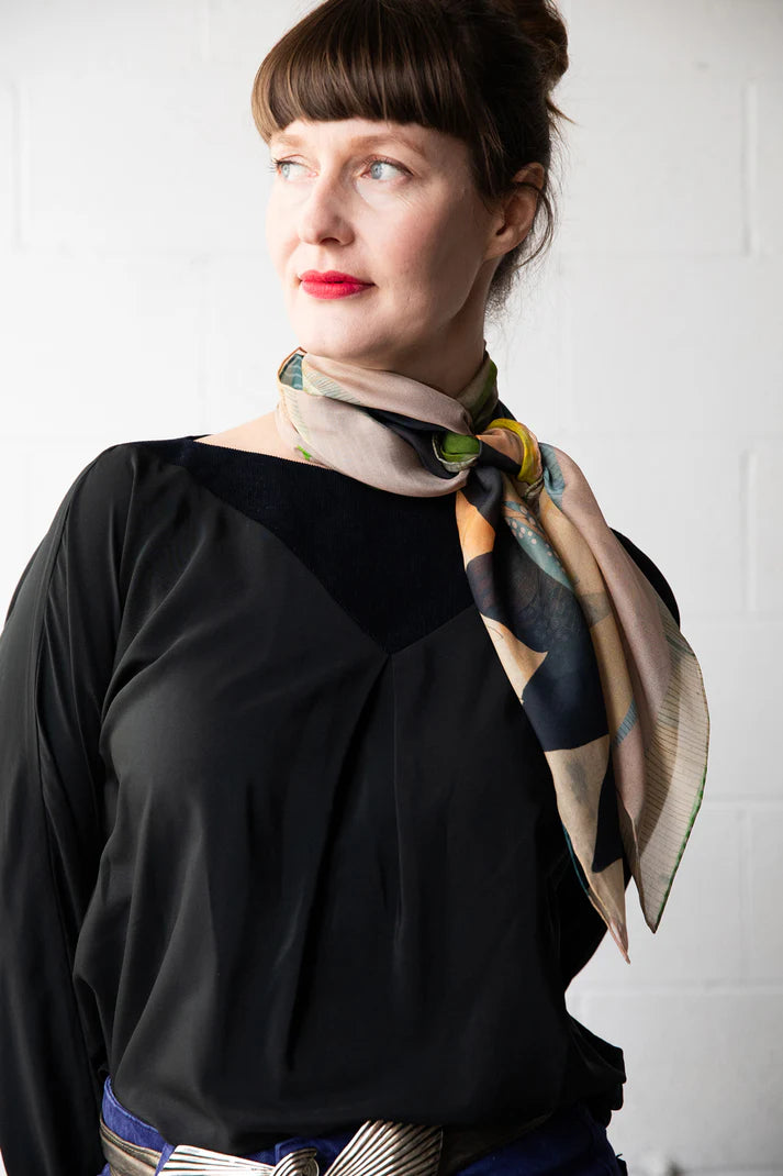 beautiful soft fabric with a great reverse print, 100 x 100cm size makes for easy wrapping around neck. the different colour ways in corners makes for flexible colour styling. it can be worn featuring the soft earthy pink tones of landscape or folded to the other corner to emphasis the dark blues and oranges of the banksia and night time sky