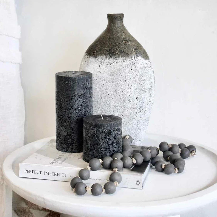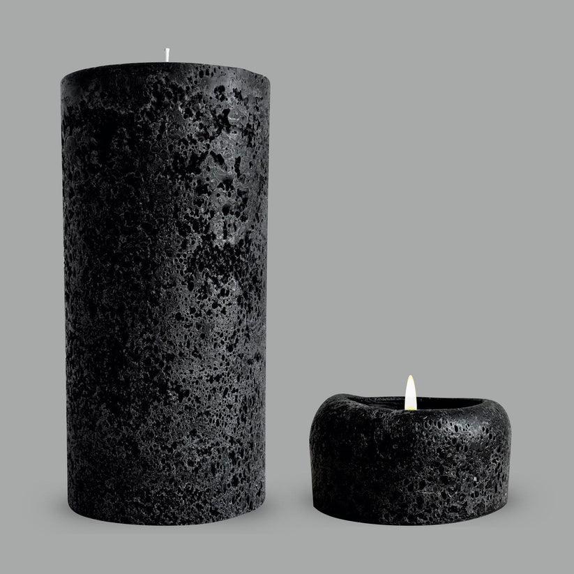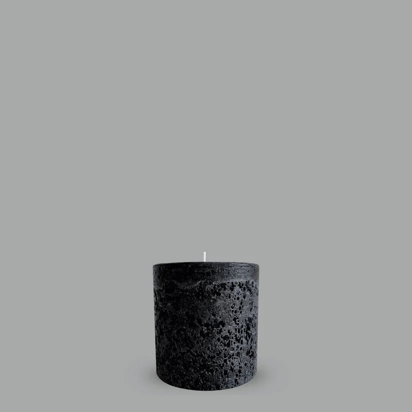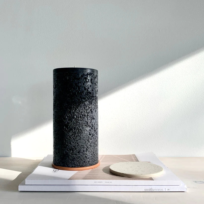 Our oversized textured column candle in Black. Hand-poured at low temperature to create a natural, stone texture, these big candles are an impressive way to style your space. As the bubble texture is a natural effect of the cold-pour process, each candle has its own distinct character.