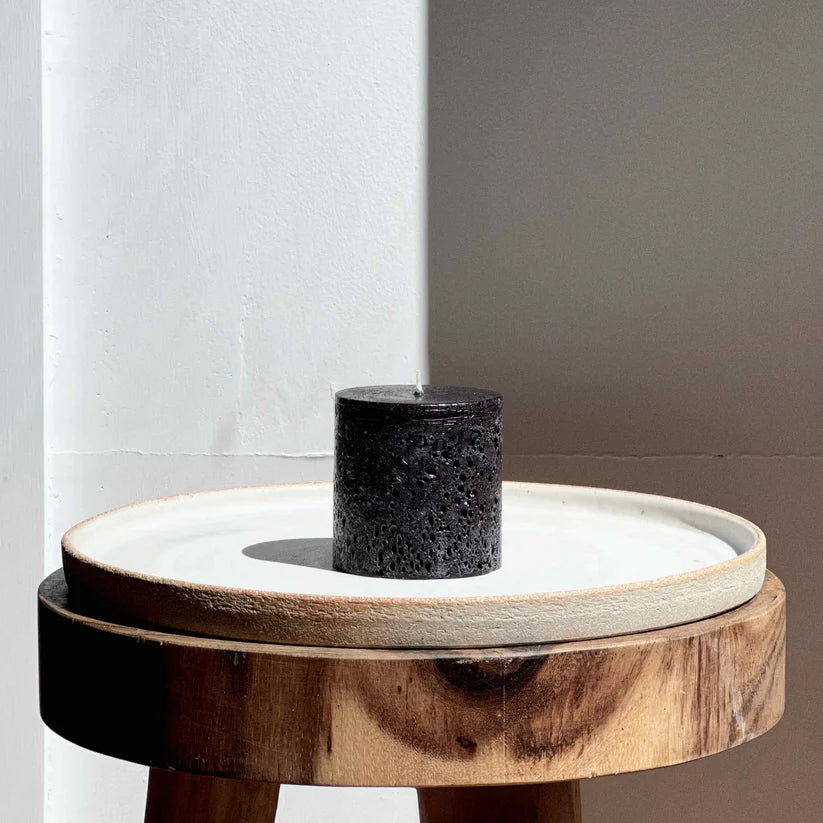 Small pillar candle with a natural rustic texture in a neutral, earthy tone Great for gifting and for styling events, weddings, homes and venues alike.