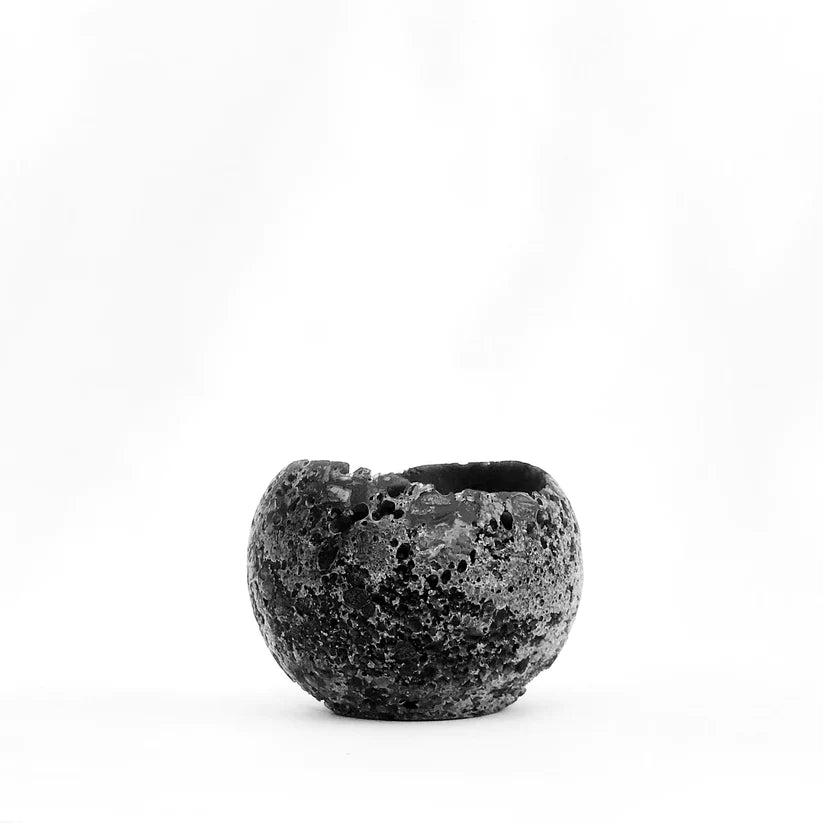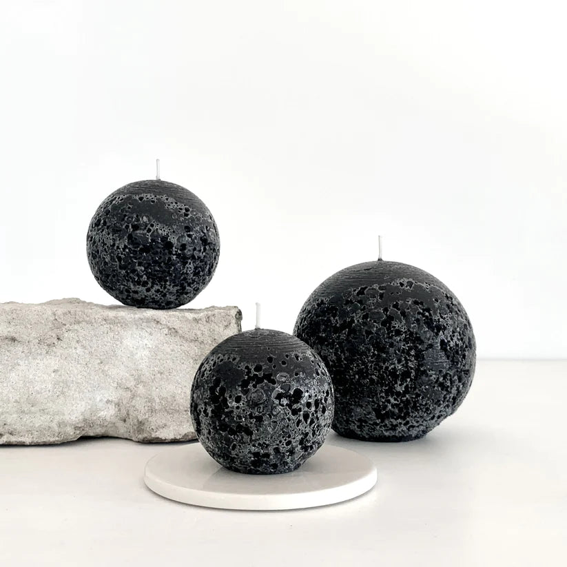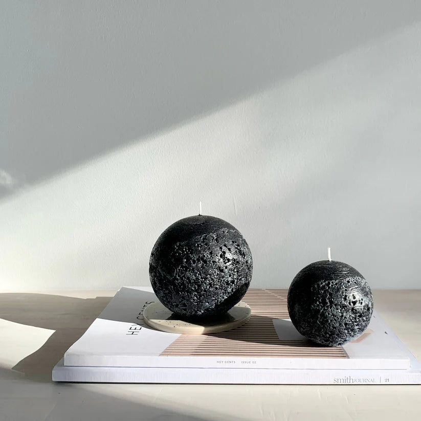 A Sphere Candle with an imposing black texture. Hand-poured at low temperature to create a rock-like texture.
