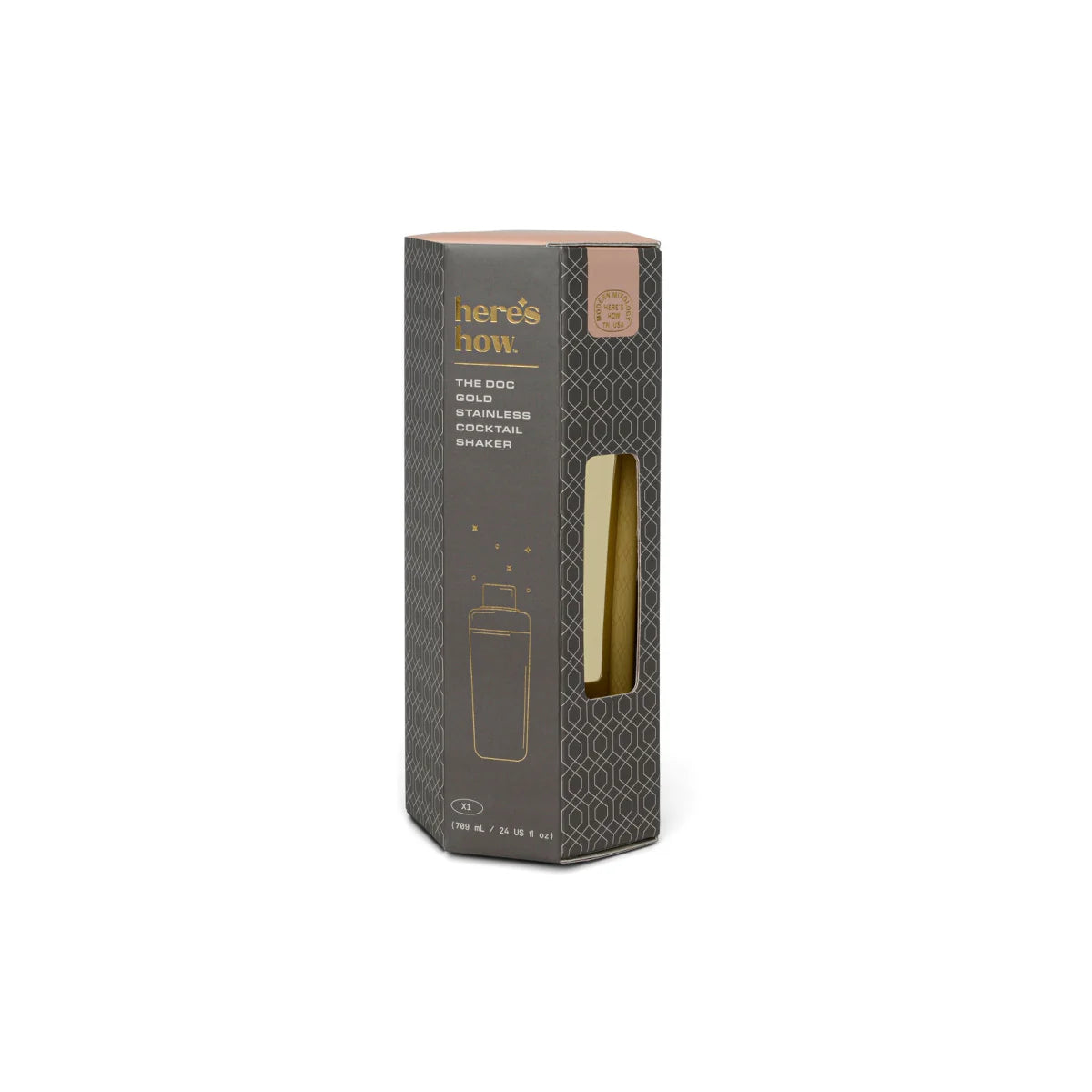 The Here's How The Doc Stainless Cocktail Shaker Gold 709ML is a sleek and stylish tool for creating perfectly mixed cocktails, combining functionality with a luxurious gold finish.